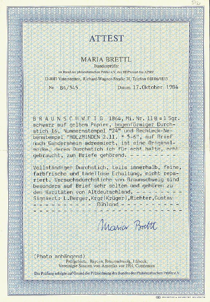 | Zusatzinformationen und Suchstichworte: | Dr. Derichs 173. Auktion 4. November 2023 Los 607 Altdeutschland Braunschweig 1 Silbergroschen schwarz auf gelb, bogenförmiger Versuchsdurchstich, ringsum einwandfreier Durchstich, dieser oben und rechts "innerhalb" mit Teilen der oberen und rechten Nachbarmarke, auf kleinem Brief mit Nummernstempel "24." und Aufgabe-Ra2 "Holzminden 2/11" nach Gandersheim mit rückseitigem blauen Ra2 "Gandersheim". Luxus. Auf Brief eine der großen Altdeutschland-Seltenheiten. Fotoattest Georg Richter (1937), Fotoattest Brettl BPP und Fotoattest Lange BPP: "Die Erhaltung ist in frischer Farbe und einwandfrei. Versuchsdurchstiche von Braunschweig, besonders auf Brief, sind sehr selten und gehören zu den Raritäten von Braunschweig.". (Michel 11.000.-) Ausruf 3.500,00 EUR |