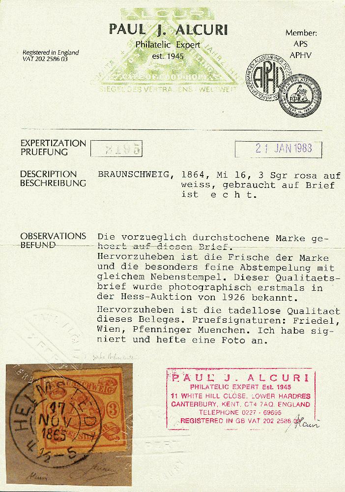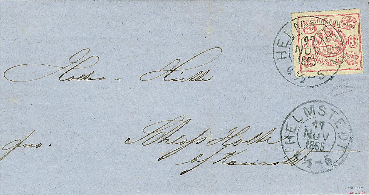 | Zusatzinformationen und Suchstichworte: | Dr. Derichs 173. Auktion 4. November 2023 Los 609 Altdeutschland Braunschweig 3 Silbergroschen lebhaftlilarot, bogenförmig durchstochen, auf Brief mit idealem K2 "Helmstedt 17 Nov.1865" auf der Marke und nochmals beigesetzt nach Schloß Holte/Preußische Westfalenprovinz. Luxus. Bleistiftsignatur Friedl, geprüft Pfenninger, Attest Alcuri und Fotoattest Brettl BPP: "Vollständiger Durchstich und in feiner, tadelloser Erhaltung, nicht repariert. Sauberer, klar gestempelter Brief." Ausruf 1.200,00 EUR |