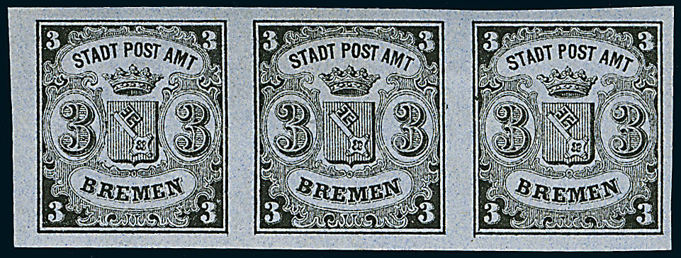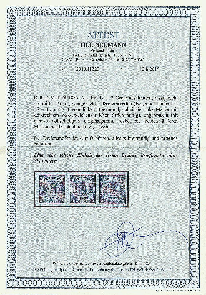 | Zusatzinformationen und Suchstichworte: | Dr. Derichs 173. Auktion 4. November 2023 Los 612 Altdeutschland Bremen 3 Grote schwarz auf blaugrau, waagerecht gestreiftes Papier, breitrandiger waagerechter Dreierstreifen mit vollständiger Originalgummierung, die für die beiden Außenmarken das Prädikat "POSTFRISCH" erfordert. Luxus. Die Einheit stammt vom linken Bogenrand und zeigt die Bogenpositionen 13 bis 15 mit allen drei Markentypen in der Typfolge "I-II-III". Als Besonderheit weist die linke Marke einen senkrechten wasserzeichenähnlichen Strich auf, der mittig durch das Markenbild läuft. Unsigniert, Fotoattest Neumann BPP: "Der Dreierstreifen ist sehr farbfrisch, allseits breitrandig und tadellos erhalten. Eine sehr schöne Einheit der ersten Bremer Briefmarke ohne Signaturen." Ausruf 600,00 EUR |