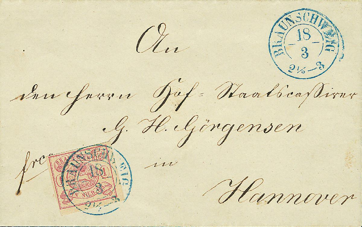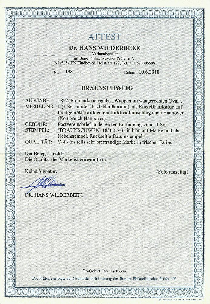 | Zusatzinformationen und Suchstichworte: | Dr. Derichs 173. Auktion 4. November 2023 Los 584 Altdeutschland Braunschweig 1 Silbergroschen karmin, vierseitig voll- bis sehr breitrandig als Solofrankatur auf Postvereinsbrief mit zwei schön in Blau aufgesetzten K2 "Braunschweig 18/3" nach Hannover. Luxus. Ein ungewöhnlich frischer Qualitätsbrief der ersten Marke des Herzogtums. Fotoattest Dr. Wilderbeek BPP: "Die Qualität der Marke ist einwandfrei.". (Michel 1.200.-+). |