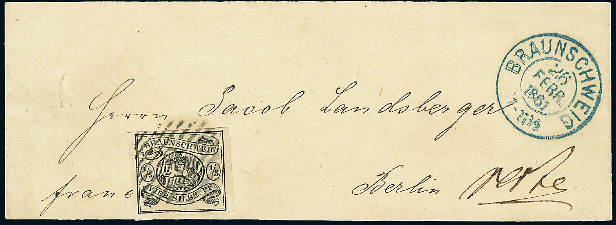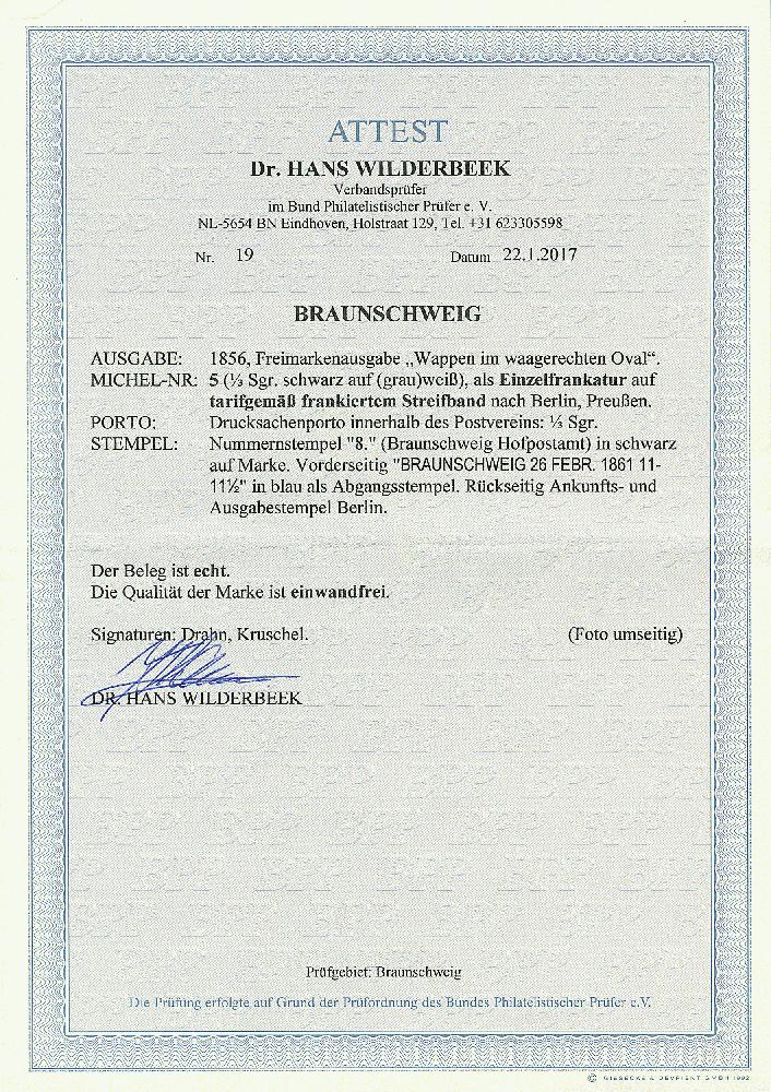 | Zusatzinformationen und Suchstichworte: | Dr. Derichs 173. Auktion 4. November 2023 Los 592 Altdeutschland Braunschweig Beschreibunroschen schwarz auf weiß, vierseitig breitrandig als Einzelfrankatur auf vollständigem Streifband (ohne Drucksachen-Inhalt) mit schwarzem Nummernstempel "8." und blauem Aufgabe-K2 "Braunschweig 26 Febr.1861" nach Berlin/Königreich Preußen. Luxus. Eine so schöne und dabei qualitativ so hochwertige Einzelfrankatur dieser Marke ist von großer Seltenheit. Fotoattest Dr. Wilderbeek BPP: "Die Qualität der Marke ist einwandfrei.". (Mi. 3.200.-+) Ausruf 1.200,00 EUR |