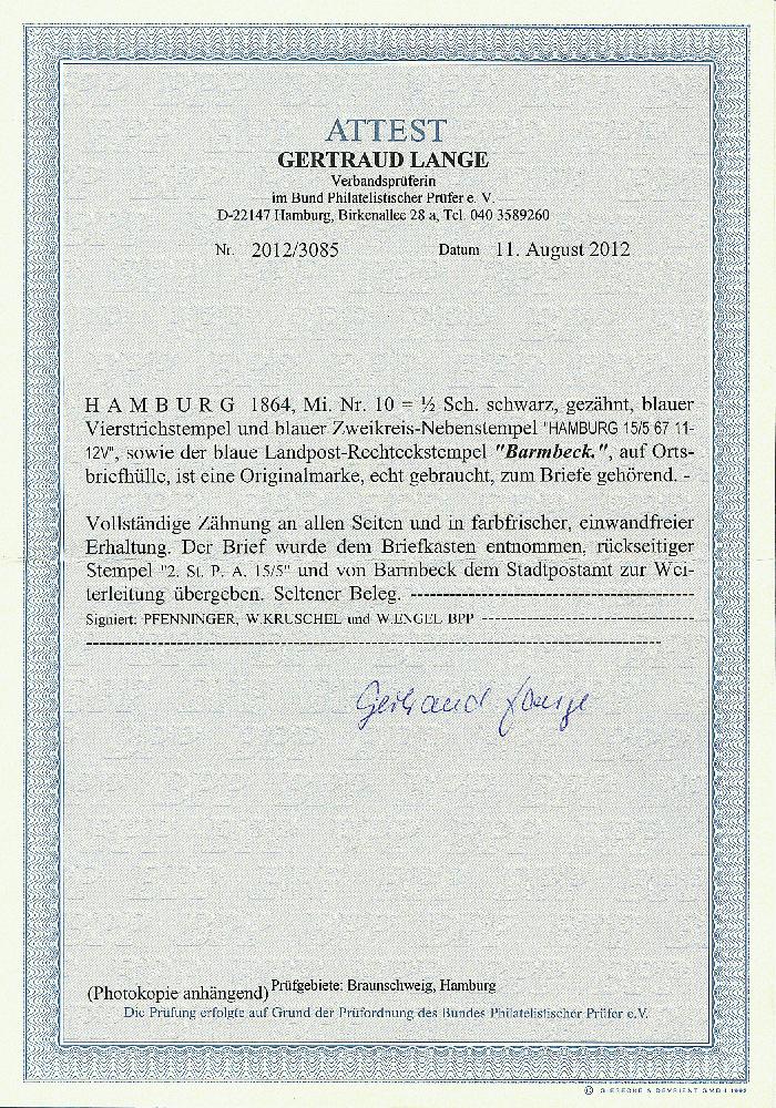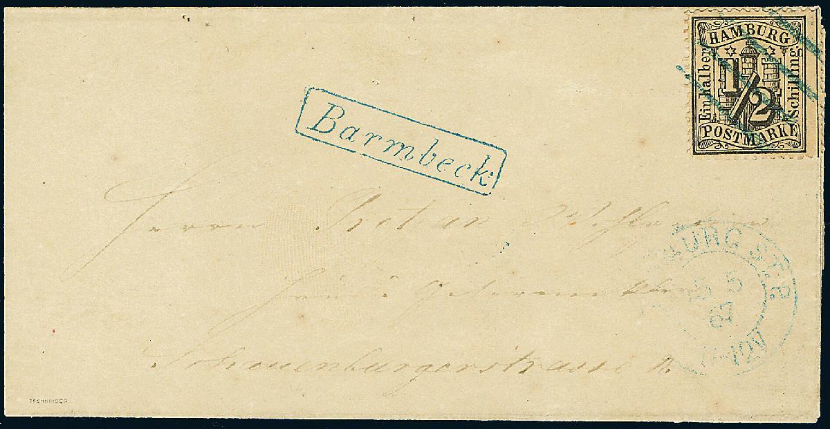 | Zusatzinformationen und Suchstichworte: | Dr. Derichs 173. Auktion 4. November 2023 Los 620 Altdeutschland Hamburg 1/2 Schilling schwarz, Einzelfrankatur auf kleinem Kabinett-Ortsbrief mit blauem Strichstempel als Entwerter, nebengesetztem blauen K2 "Hamburg St.P. 15.5.67" und nebengesetztem, idealen blauen Landpost-Stempel "Barmbeck". Geprüft Walter Engel BPP und Pfenninger sowie Fotoattest Lange BPP: "Vollständige Zähnung an allen Seiten und in farbfrischer, einwandfreier Erhaltung... Seltener Beleg." Ausruf 800,00 EUR |