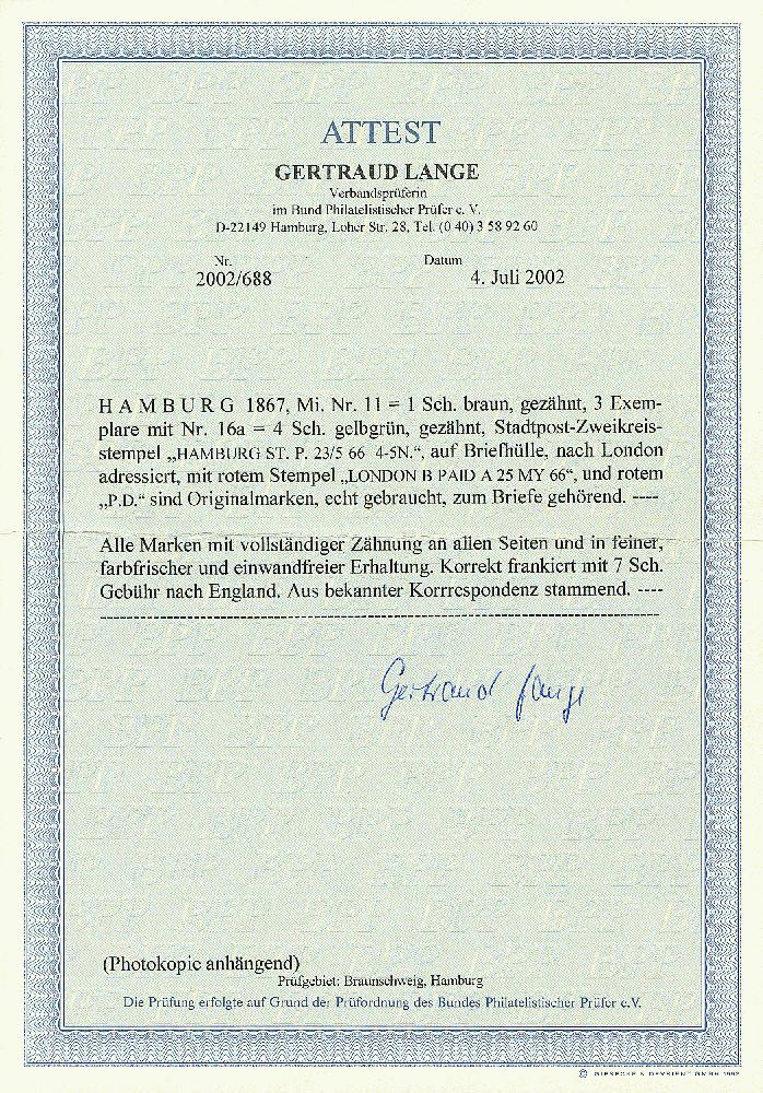 | Zusatzinformationen und Suchstichworte: | Dr. Derichs 173. Auktion 4. November 2023 Los 626 Altdeutschland Hamburg 1 Schilling braun, drei Exemplare, und 4 Schilling gelbgrün als 7-Schilling-Porto auf frischem Brief mit blauen K2 "Hamburg St.P. 23.5.66" auf den Marken und nochmals beigesetzt nach London/Großbritannien, nebengesetzt roter "P.D." und roter "London Paid". Luxus. Aus der bekannten Elmenhorst-Korrespondenz, wobei für den hier vorliegenden Brief positiv hervorzuheben ist, daß die Adresse ausnahmsweise nicht überschrieben ist. Eine ungewöhnliche Darstellung des 7-Schilling-Portos mit vier Marken an Stelle einer Einzelfrankatur der 7-Schilling-Marke. Fotoattest Lange BPP: "in feiner, farbfrischer und einwandfreier Erhaltung" Ausruf 800,00 EUR |