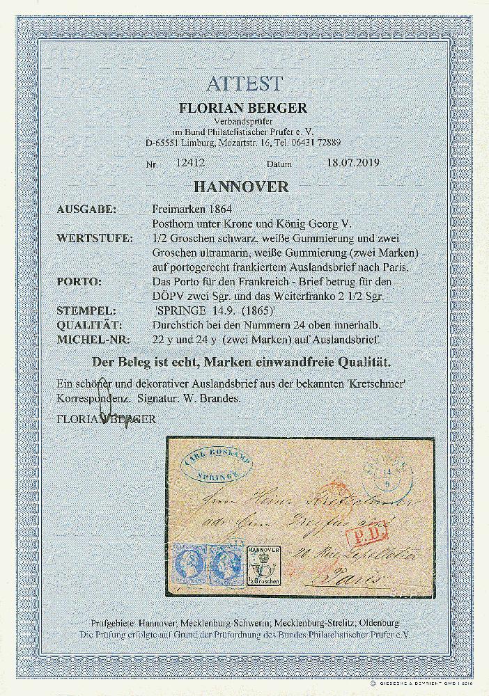 | Zusatzinformationen und Suchstichworte: | Dr. Derichs 173. Auktion 4. November 2023 Los 647 Altdeutschland Hannover 1/2 Groschen schwarz und zweimal 2 Groschen ultramarin, alle "weiße Gummierung" und tadellos durchstochen, bei den blauen Marken Durchstich oben "innerhalb", auf Auslandsbrief mit blauem K2 "Springe 14/9" (1865) zweimal auf den Marken und ein drittes Mal rechts oben beigesetzt nach Paris/Frankreich, nebengesetzt roter "P.D." und roter Grenzübergangsstempel. Luxus. Tarifgerechte 4 1/2-Groschen-Frankatur mit 2 Groschen für den Postverein und 2 1/2 Groschen Weiterfranko. Frankierte Auslandsbriefe - insbesondere in dieser exquisiten Qualität - sind vom Königreich Hannover selten Ausruf 750,00 EUR |