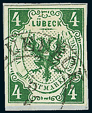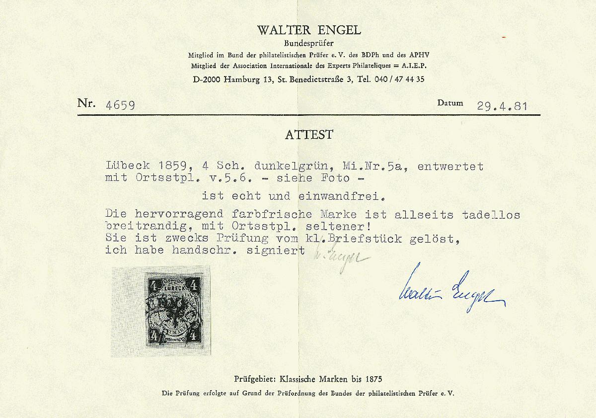 | Zusatzinformationen und Suchstichworte: | Dr. Derichs 173. Auktion 4. November 2023 Los 651 Altdeutschland Lübeck 4 Schilling dunkelgrün, vierseitig breitrandig auf Briefstück (zur Kontrolle gelöst und exakt mit Falz replaziert) mit seltener Ortsstempel-Entwertung durch K2 "Luebeck 5/6". Luxus. Fotoattest Walter Engel BPP: "echt und einwandfrei". (Michel 750.- plus 20% für Ortsstempel-Entwertung = 900.-). Ausruf 250,00 EUR |