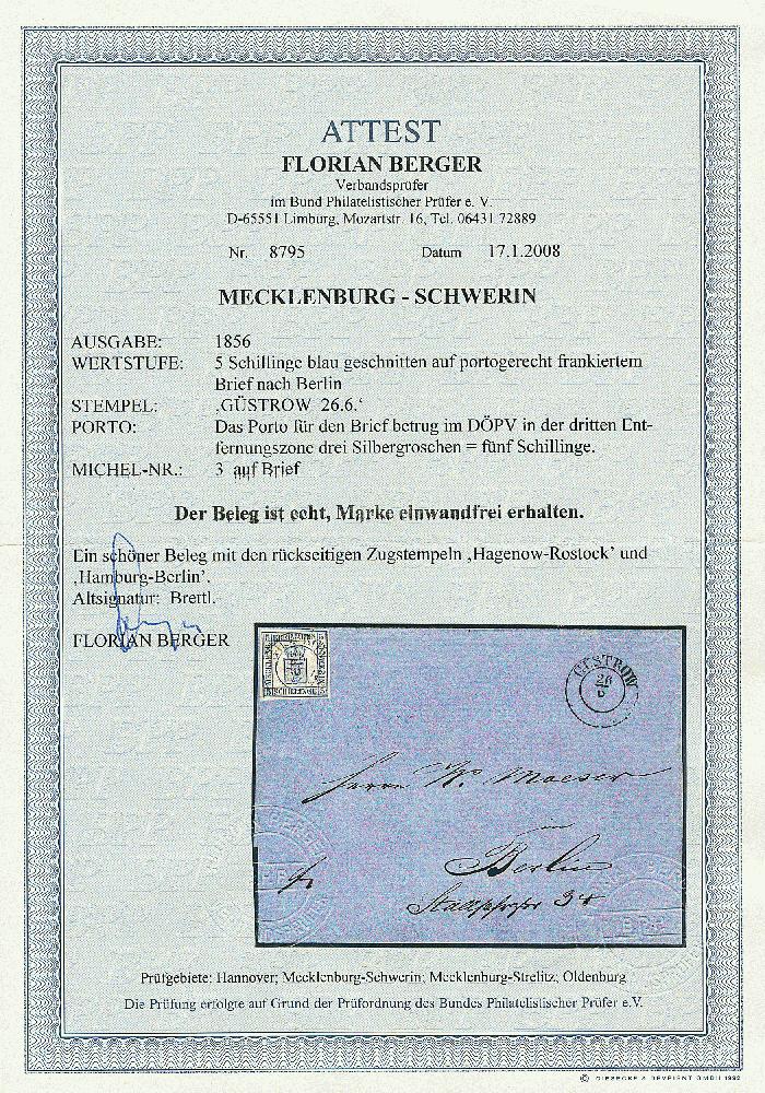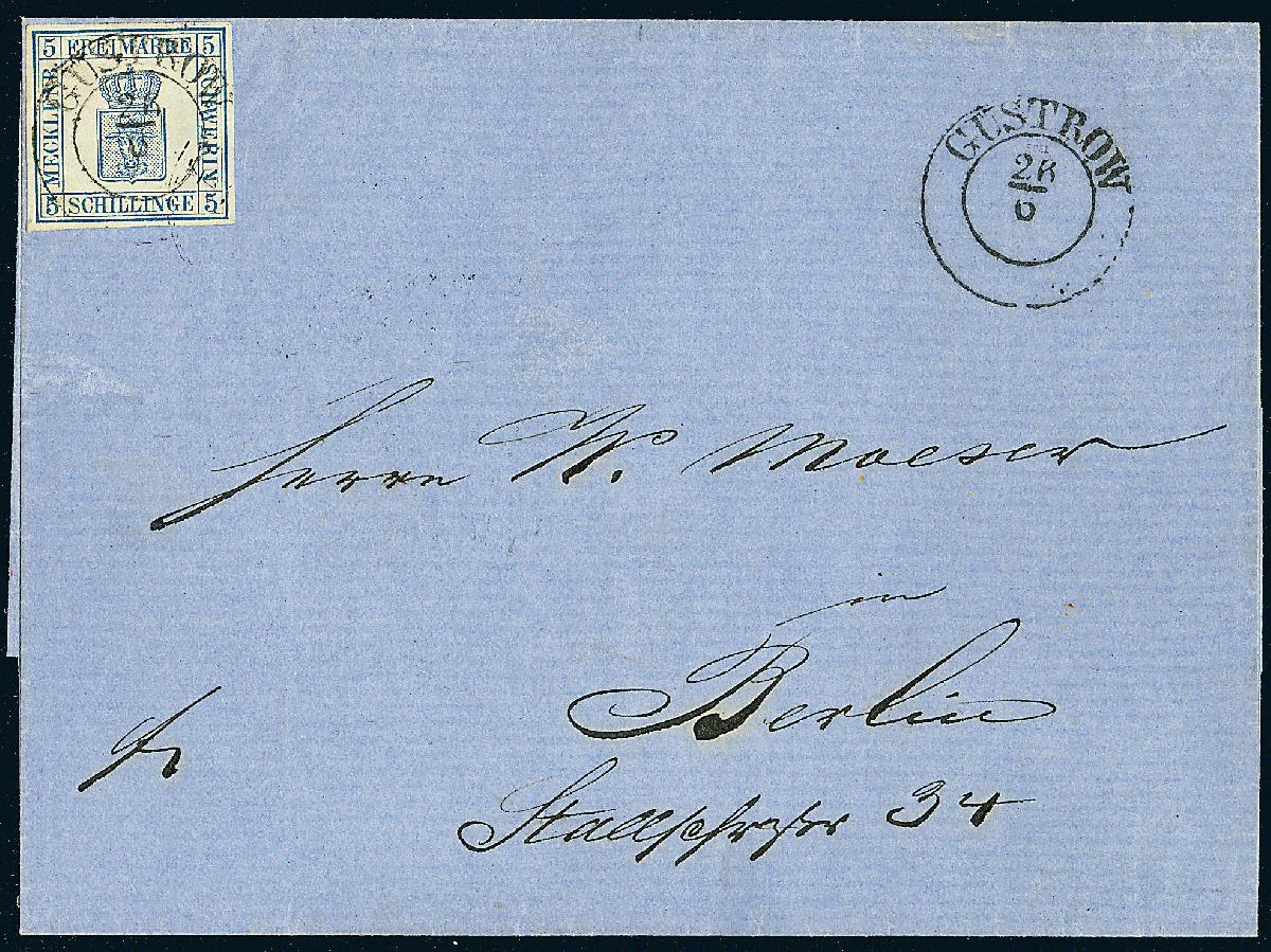 | Zusatzinformationen und Suchstichworte: | Dr. Derichs 173. Auktion 4. November 2023 Los 660 Altdeutschland Mecklenburg Schwerin 5 Schilling blau, farbtiefes und gleichmäßig voll- bis breitrandiges Stück auf Brief mit K2 "Güstrow 26/6" einmal auf der Marke und nochmals beigesetzt nach Berlin, rückseitig mit mecklenburgischem Bahnpost-K2 "Hagenow/Rostock" und preußischem Bahnpost-L3 "Hamburg/Berlin". Luxus. Ein farblich reizvolles Stück: "Blaue Marke auf blauem Brief" Ausruf 750,00 EUR |