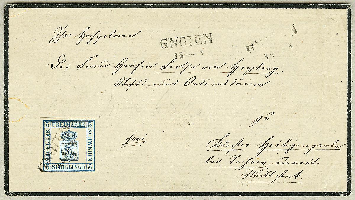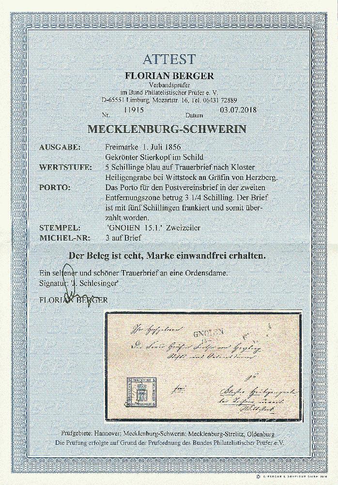 | Zusatzinformationen und Suchstichworte: | Dr. Derichs 173. Auktion 4. November 2023 Los 661 Altdeutschland Mecklenburg Schwerin 5 Schilling blau, vierseitig gleichmäßig voll- bis breitrandig auf Trauerkuvert mit mehrfach aufgesetztem Zweizeiler "Gnoien 15/1" nach Kloster Heiligengrabe bei Wittstock, adressiert an "Ihrer Hochgeboren Der Frau Gräfin Bertha von Herzberg Stifts- und Ordensdame". Luxus-Qualität. Fotoattest Berger BPP: "einwandfrei erhalten. Ein seltener und schöner Trauerbrief an eine Ordensdame." Ausruf 1.000,00 EUR |