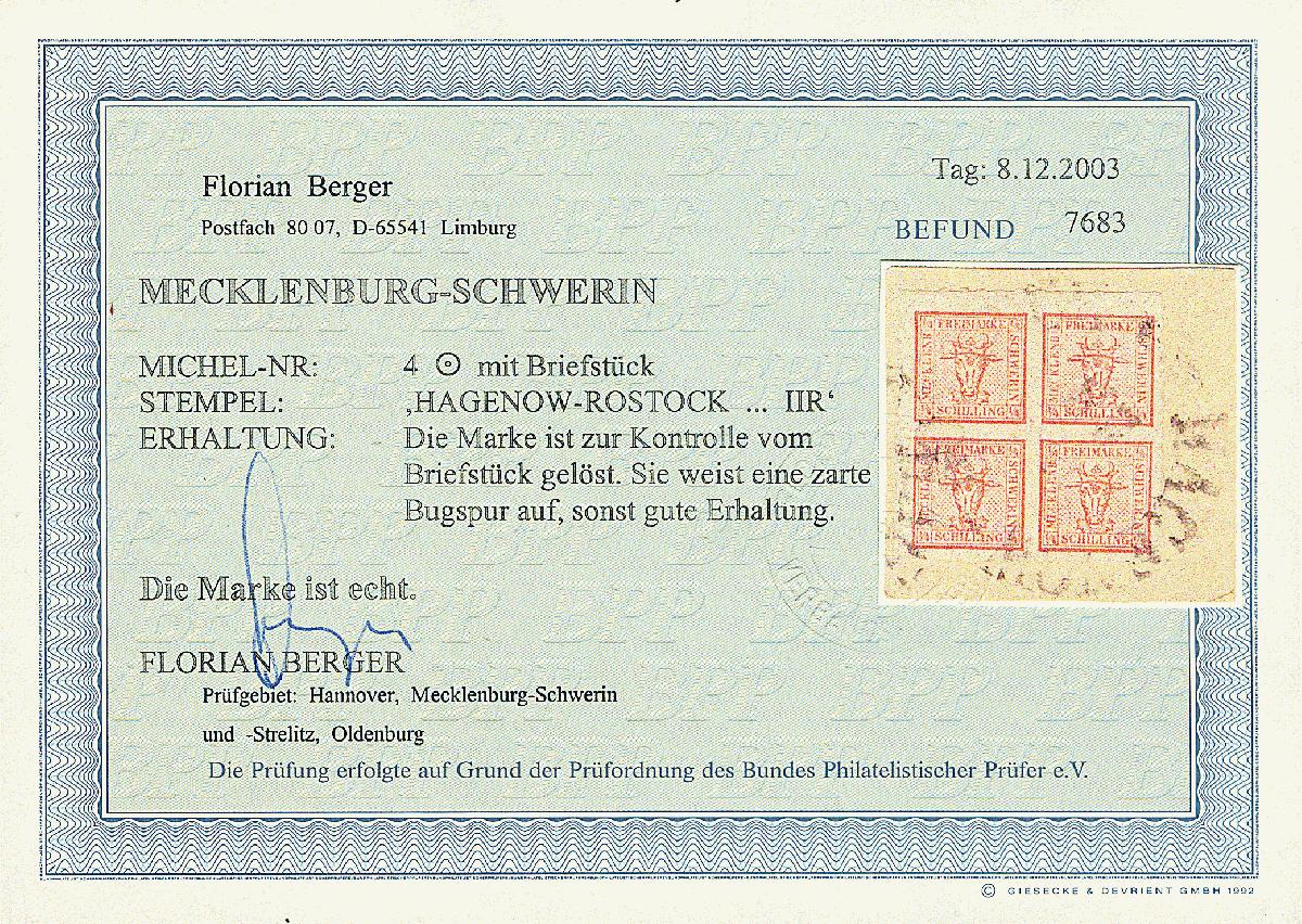 | Zusatzinformationen und Suchstichworte: | Dr. Derichs 173. Auktion 4. November 2023 Los 663 Altdeutschland Mecklenburg Schwerin 4/4 Schilling graurot, durchstochen mit punktiertem Grund, zarte Bugspur und sonst einwandfrei, mit Bahnpost-Stempel "Hagenow-Rostock II R" (dazugehöriges Briefstück beiliegend). Dies ist die seltenste Hauptkatalognummer von Mecklenburg-Schwerin. Fotobefund Berger BPP. (Michel 2.500.-) Ausruf 250,00 EUR |