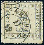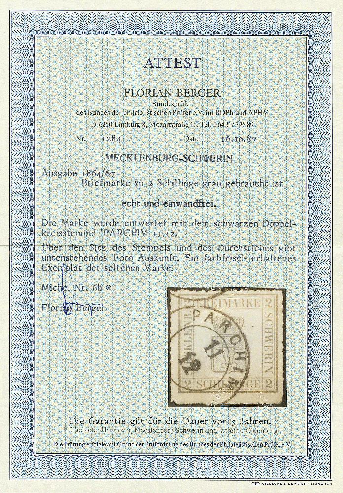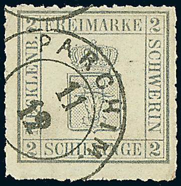 | Zusatzinformationen und Suchstichworte: | Dr. Derichs 173. Auktion 4. November 2023 Los 664 Altdeutschland Mecklenburg Schwerin 2 Schilling blaugrau, Luxusstück mit idealem K2 "Parchim 11/12". Echt gestempelt und vor allem in einwandfreier Qualität ist dies eine der seltensten Marken der Altdeutschen Staaten und gemessen beispielsweise an den "b"- und "c"-Farben des "Sachsen-Dreiers", die häufiger vorkommen als eine "Schwerin 6b", ist ihre Bewertung im Michel-Katalog viel zu niedrig. Fotoattest Berger BPP: "echt und einwandfrei". (Michel 2.000.-++) Ausruf 1.200,00 EUR |