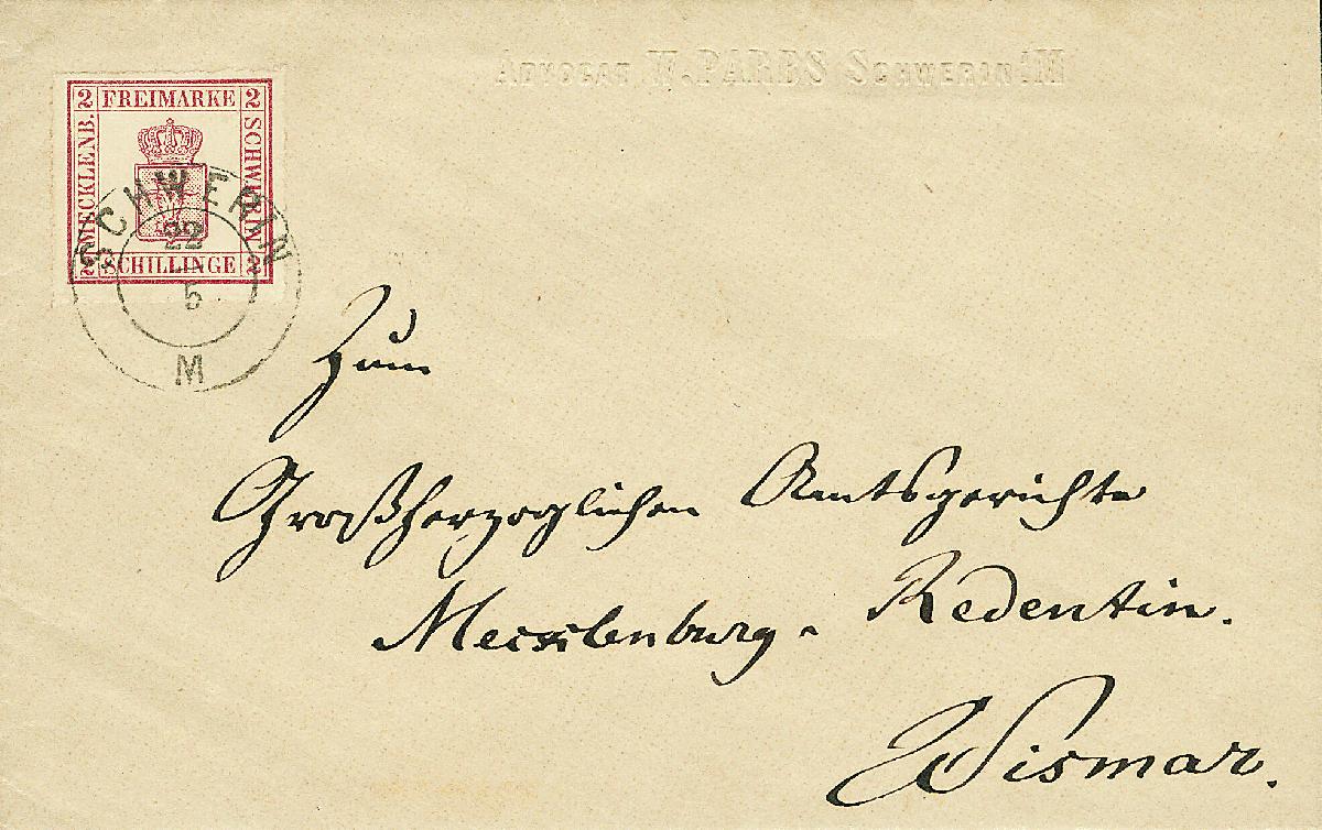 | Zusatzinformationen und Suchstichworte: | Dr. Derichs 173. Auktion 4. November 2023 Los 666 Altdeutschland Mecklenburg Schwerin 2 Schilling dunkelmagenta, Luxusstück als Einzelfrankatur auf Brief mit ganz idealem K2 "Schwerin 22/5 M" nach Wismar. Die Rückseite des Briefes ist nicht ganz vollständig und wurde neu geklebt, auf der Vorderseite findet sich eine ungewöhnliche und dekorative Absenderprägung "Advocat W.PARBS Schwerin i.M.". Sicherlich handelt es sich bei diesem Brief mit seiner perfekten Abstempelung und seiner akkurat geschriebenen Adresse um eine der schönsten Einzelfrankaturen dieser Marke. Fotoattest Berger BPP: "echt und einwandfrei" Ausruf 1.000,00 EUR |