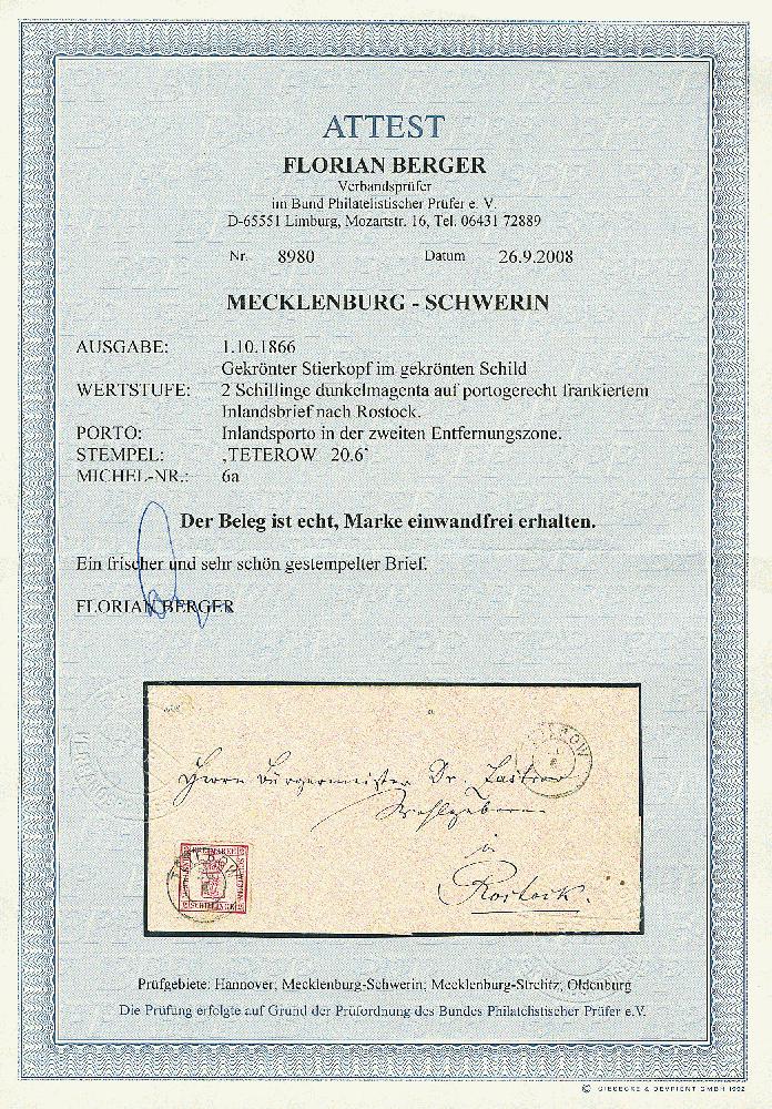 | Zusatzinformationen und Suchstichworte: | Dr. Derichs 173. Auktion 4. November 2023 Los 667 Altdeutschland Mecklenburg Schwerin 2 Schilling dunkelmagenta, Einzelfrankatur auf ganz vorbildlichem Brief mit idealem K2 "Teterow 20/6" zentrisch und gerade auf der Marke und nochmals beigesetzt. Luxus. Korrektes Inlandsporto in der zweiten Entfernungszone. Fotoattest Berger BPP: "einwandfrei erhalten... Ein frischer und sehr schön gestempelter Brief.". Ausruf 1.000,00 EUR |