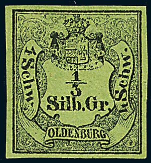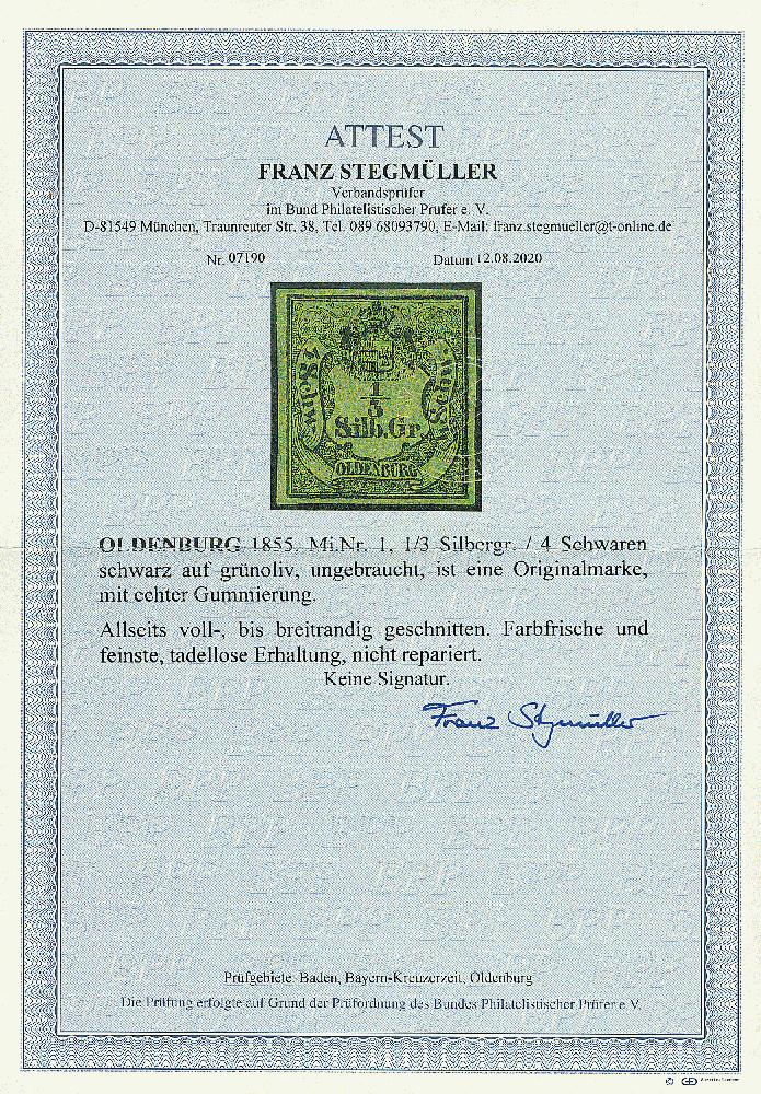 | Zusatzinformationen und Suchstichworte: | Dr. Derichs 173. Auktion 4. November 2023 Los 675 Altdeutschland Oldenburg 1/3 Silbergroschen schwarz auf grün, vierseitig voll- bis breitrandig, ungebraucht mit vollständiger Originalgummierung. Luxus. Ungebrauchte Exemplare der ersten Marke Oldenburgs sind wesentlich seltener anzutreffen als gestempelte. Unsigniert, Fotoattest Stegmüller BPP: "Farbfrische und feinste, tadellose Erhaltung, nicht repariert.". (Michel 1.500.-+) Ausruf 500,00 EUR |