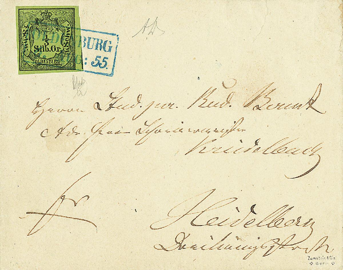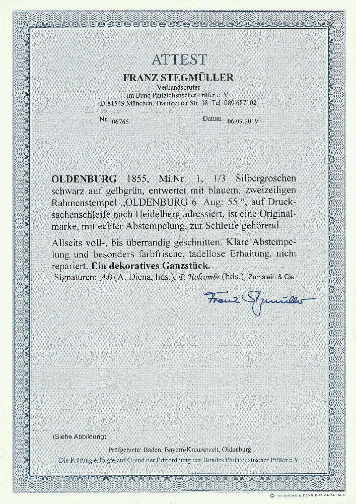 | Zusatzinformationen und Suchstichworte: | Dr. Derichs 173. Auktion 4. November 2023 Los 677 Altdeutschland Oldenburg \STREIFBAND NACH BADEN\: 1/3 Silbergroschen schwarz auf grün, vierseitig voll- bis breitrandig bzw. rechts unten sogar mit Ansatz der Nachbarmarke, als tarifgerechte Einzelfrankatur auf vollständiger Drucksachenschleife (ohne Inhalt) mit blauem Ra2 "Oldenburg 6.Aug:55" in den Postverein nach Heidelberg/Großherzogtum Baden gelaufen. Luxus. Es sind nur wenige Streifbänder Oldenburgs in die Süddeutschen Staaten bekannt. Fotoattest Stegmüller BPP: "besonders farbfrische, tadellose Erhaltung, nicht repariert.". (Michel 3.800.-+) Ausruf 1.500,00 EUR |