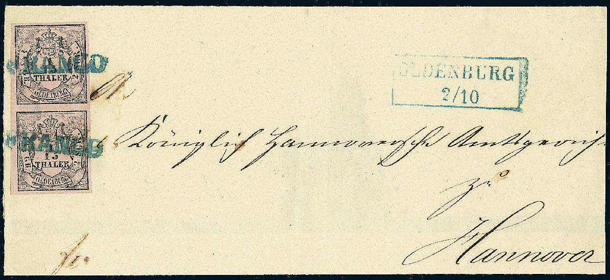 | Zusatzinformationen und Suchstichworte: | Dr. Derichs 173. Auktion 4. November 2023 Los 683 Altdeutschland Oldenburg 1/15 Thaler schwarz auf rosa, Type "I", senkrechtes Paar, vierseitig breitrandig auf Brief (rückseitig nicht komplett) mit zwei blauen Einzeilern "Franco" als Entwerter und blauem Aufgabe-Ra2 "Oldenburg 2/10" nach Hannover. Kabinett. Einheiten dieser Marke sind sehr selten, insbesondere auf Brief und vor allem in senkrechter Form Ausruf 1.000,00 EUR |