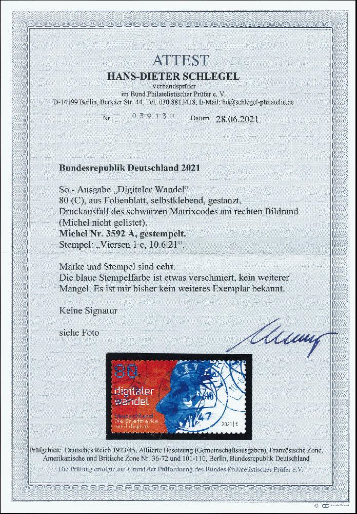 | Zusatzinformationen und Suchstichworte: | Ausgabe "Digitaler Wandel", selbstklebend, Matrixcode fehlend, Stempeldatum 10.06.2021 (BPP-Prüfung wenige Tage später). Auktionshaus Heinrich Köhler, 377. Auktion (20.09.-25.09.2021), Los 2500, Ausruf 1.000,00 Euro, Zuschlag 3.400,00 Euro. Quelle: https://heinrich-koehler.de/de/node/1349973 |