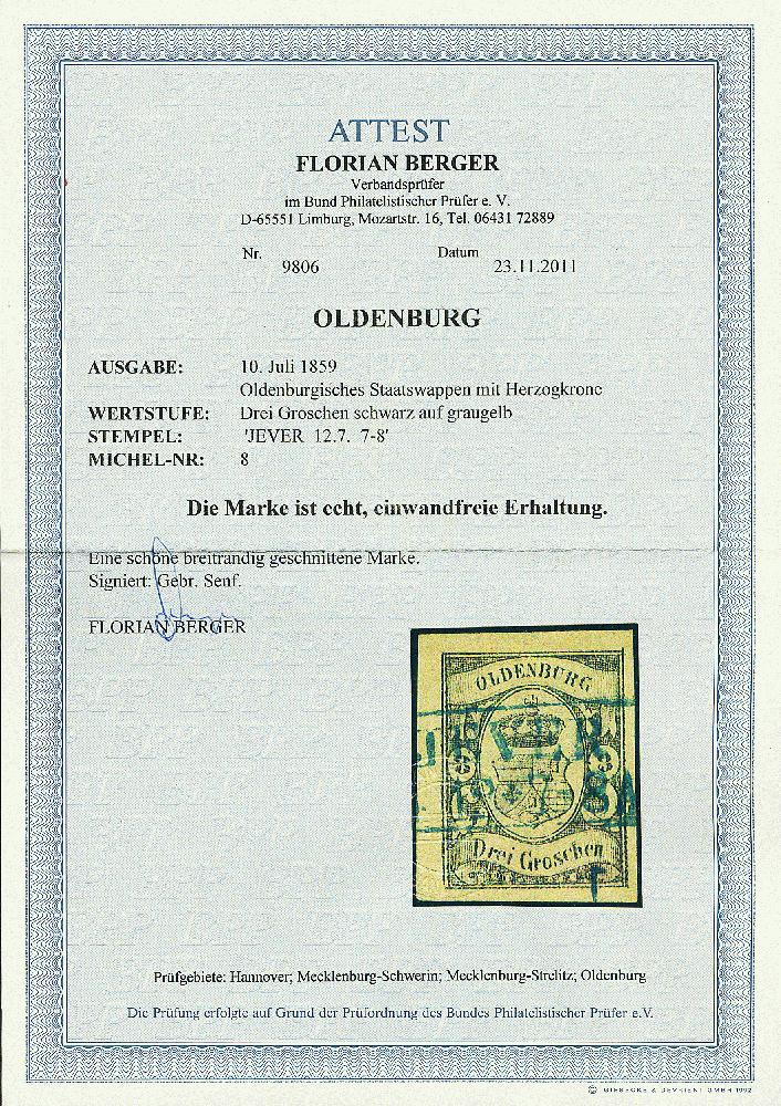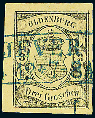 | Zusatzinformationen und Suchstichworte: | Dr. Derichs 173. Auktion 4. November 2023 Los 686 Altdeutschland Oldenburg 3 Groschen schwarz auf gelb, vierseitig breitrandig mit blauem Ra2 "Jever 12/7". Luxus. Fotoattest Berger BPP: "einwandfreie Erhaltung". (Michel 750.-) Ausruf 250,00 EUR |