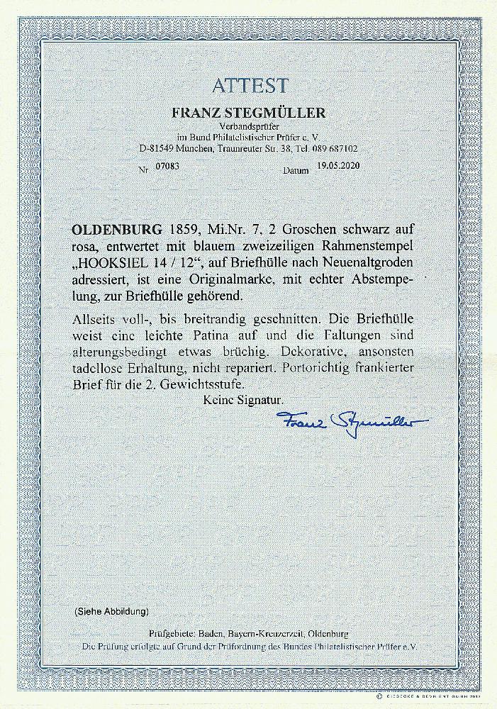 | Zusatzinformationen und Suchstichworte: | Dr. Derichs 173. Auktion 4. November 2023 Los 687 Altdeutschland Oldenburg 2 Groschen schwarz auf rosa, ringsum voll- bis breitrandiges Kabinettstück als Einzelfrankatur auf Brief (dieser leichte "Patina" und innseitig in den Faltungen etwas brüchig) mit dreimal aufgesetztem blauen Ra2 "Hooksiel 14/12" nach Neuenaltgroden Kirchspiel Neuende gelaufen. Tarifrichtige 2-Groschen-Frankatur für die zweite Gewichtsstufe (links oben Vermerk "1 2/10 Loth"). Fotoattest Stegmüller BPP. (Michel 3.200.-) Ausruf 750,00 EUR |