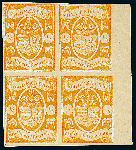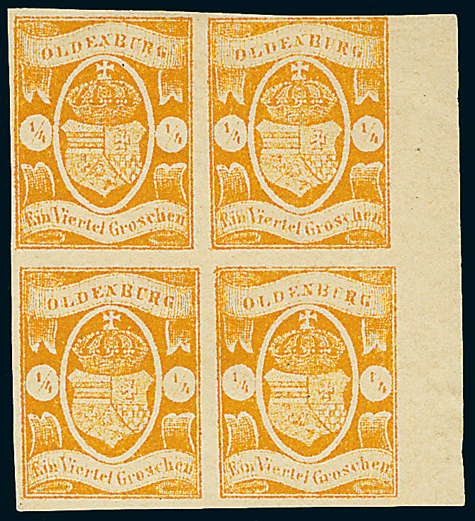 | Zusatzinformationen und Suchstichworte: | Dr. Derichs 173. Auktion 4. November 2023 Los 691 Altdeutschland Oldenburg 1/4 Groschen orange, ungebrauchter Viererblock mit vollständiger Originalgummierung, rechts mit 6,5mm breitem Bogenrand und an den anderen drei Seiten ebenfalls voll- bis breitrandiger Randverlauf. Luxus-Qualität. Unsigniert, Fotoattest Stegmüller BPP: "Farbfrische und feine, tadellose Erhaltung, nicht repariert.". Anmerkung zur Seltenheit: Nach dem berühmten Sechserblock (Bestandteil der "Super-Einheiten" von Oldenburg) sind inclusive des hier gezeigten Stückes nur drei Viererblocks dieser Marke bekannt, wie auch das Attest von Franz Stegmüller bestätigt Ausruf 4.000,00 EUR |