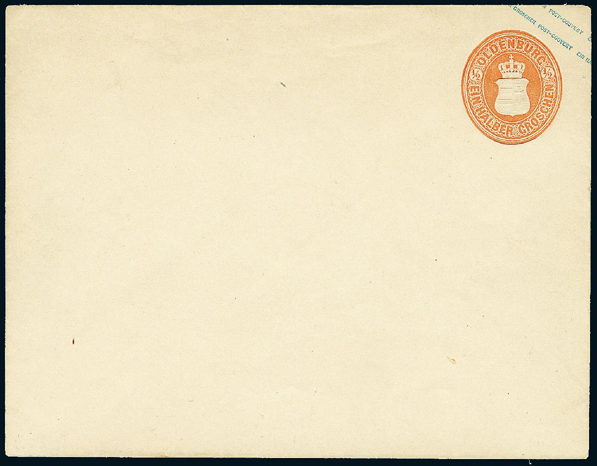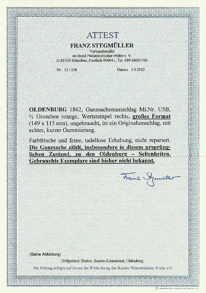 | Zusatzinformationen und Suchstichworte: | Dr. Derichs 173. Auktion 4. November 2023 Los 709 Altdeutschland Oldenburg Ganzsachenumschlag 1/2 Groschen orange, Großformat, ungebraucht in Luxus-Qualität. Unsigniert, Fotoattest Stegmüller BPP: "Farbfrische und feine, tadellose Erhaltung, nicht repariert. Die Ganzsache zählt, insbesondere in diesem ursprünglichen Zustand, zu den Oldenburg-Seltenheiten. Gebrauchte Exemplare sind bisher nicht bekannt.". (Michel 1.800.-). Anmerkung: Die Auflage dieser Ganzsache beträgt 1.900 Stück, wovon die Anzahl jener Stücke, die die Zeitumstände überlebt haben, im Promillebereich liegt Ausruf 600,00 EUR |