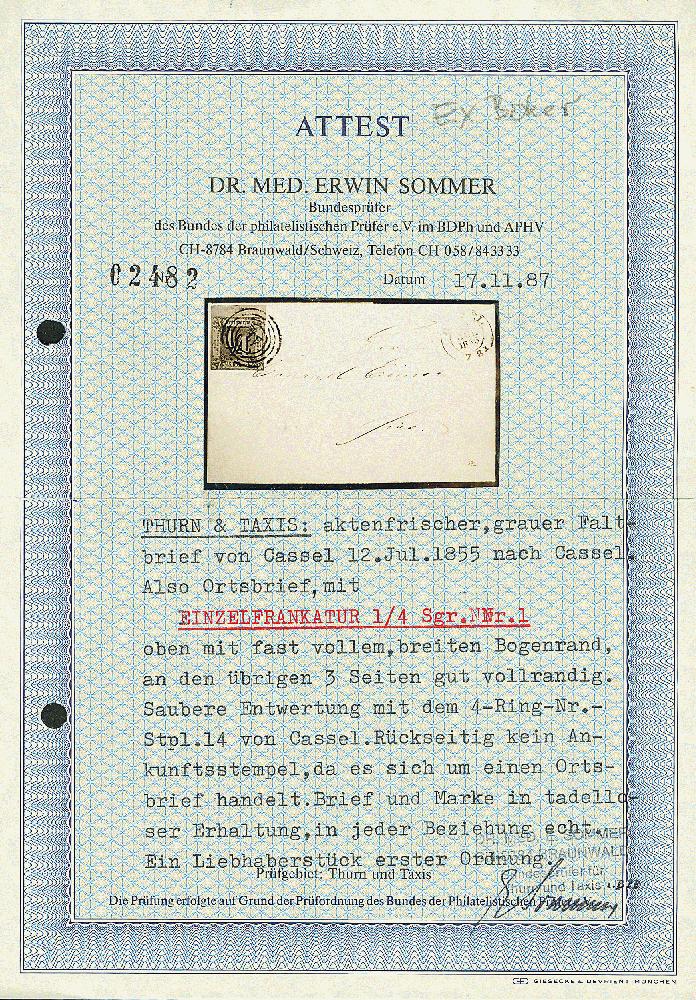 | Zusatzinformationen und Suchstichworte: | Dr. Derichs 173. Auktion 4. November 2023 Los 797 Altdeutschland Thurn und Taxis 1/4 Silbergroschen schwarz auf dunkelbraunorange, Oberrandstück mit 5mm breitem Bogenrand, auch an den anderen drei Seiten durchgehend vollrandig geschnitten, als Einzelfrankatur auf Ortsbrief (vollständiger und überwiegend gedruckter, interessanter Inhalt) mit Nummernstempel "14" und nebengesetztem K2 "Cassel 12 Jul.1855". Luxus. Fotoattest Dr. Sommer BPP Ausruf 500,00 EUR |