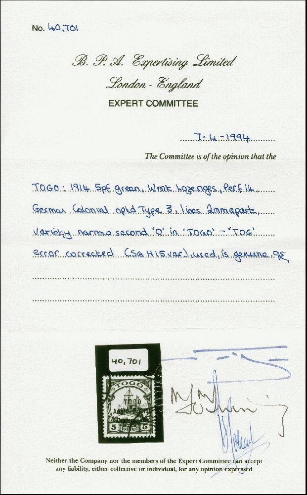 | Prüfgebiet: | Deutsche Kolonien Togo Britische Besetzung |