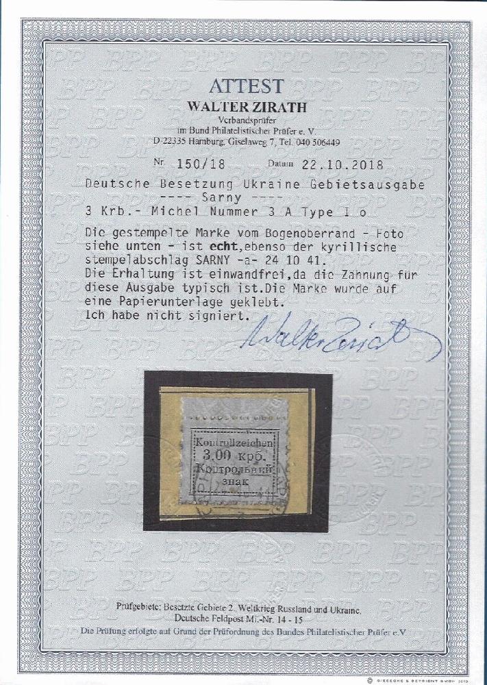 | Zusatzinformationen und Suchstichworte: | ebay.de WKII Ukraine / Sarny 1941 , Nr. 3A I , gestempelt mit Oberrand , Attest Zirath BPP !! Echt und einwandfrei . Eine seltene Marke. Very fine postmark !! Best expertized by Zirath BPP with certification. Sarny Michel No. 3 A type I with upper margin !! Rare item Ausruf 300,00 EUR |