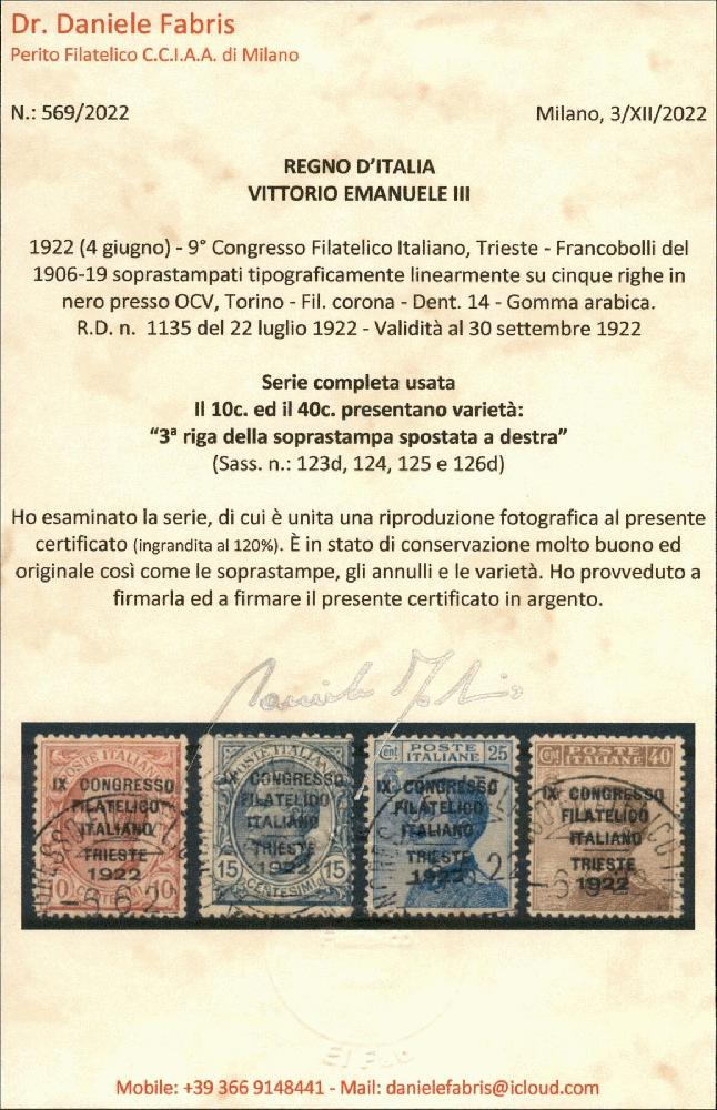 | Zusatzinformationen und Suchstichworte: | A.G. Srl Auction Gallery, Public Auction 25. Juli 2023 Los 182 Italien Königreich - Vittorio Emanuele III Regno - Vittorio Emanuele III - 1922 - Congresso Filatelico (123/126) - serie completa usata - varietà "d" per il 10 cent e per il 40 cent - cert. Fabris Ausruf 300,00 EUR |