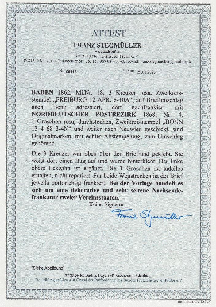 | Zusatzinformationen und Suchstichworte: | Südphila Peter Feuser 100. Jubiläums- & Charity-Auktion 18. November 2023 Los 26 Altdeutschland Norddeutscher Postbezirk 3 Kr. rosa, oben über den Rand geklebt (Bugspur und angesetzter Eckzahn), mit K2 FREIBURG auf Nachsendecouvert mit Prachtstück NDP 1 Gr. karmin nach Bonn und Neuwied, ein seltenes Poststück, Attest Stegmüller Ausruf 600,00 EUR |