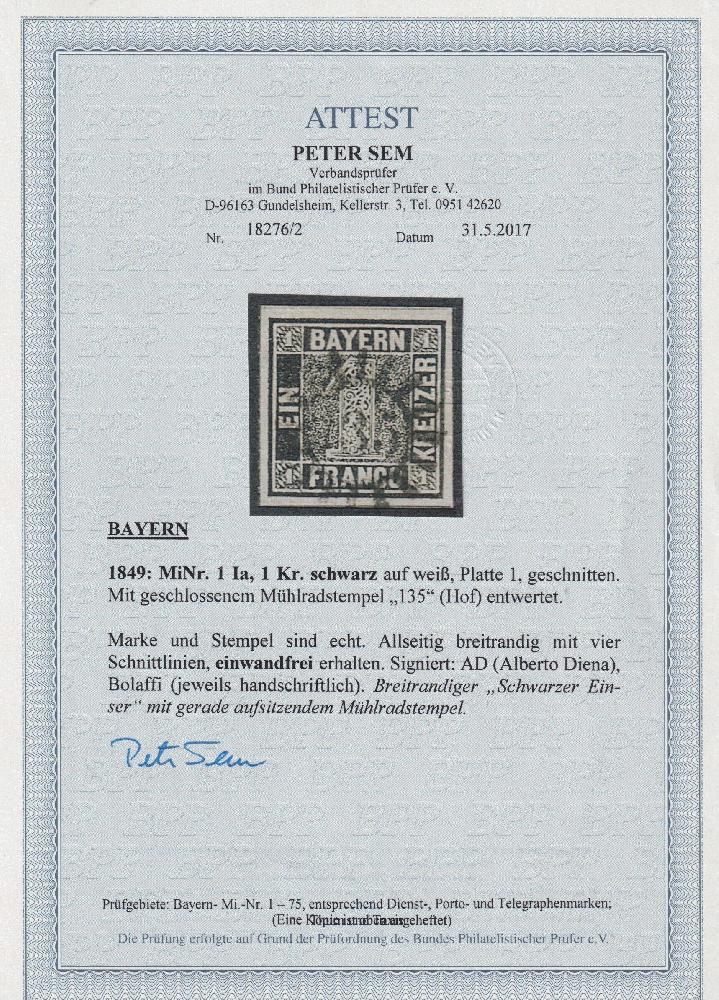 | Zusatzinformationen und Suchstichworte: | Südphila Peter Feuser 100. Jubiläums- & Charity-Auktion 18. November 2023 Los 49 Altdeutschland Bayern 1 Kr. schwarz, vorzüglich breitrandiges Luxusstück (Schnittlinien an allen Seiten) mit zentrischem und geradem MR "135" (Hof), sign. Diena, Bolaffi, Atteste Sem, Brettl Ausruf 1.500,00 EUR |