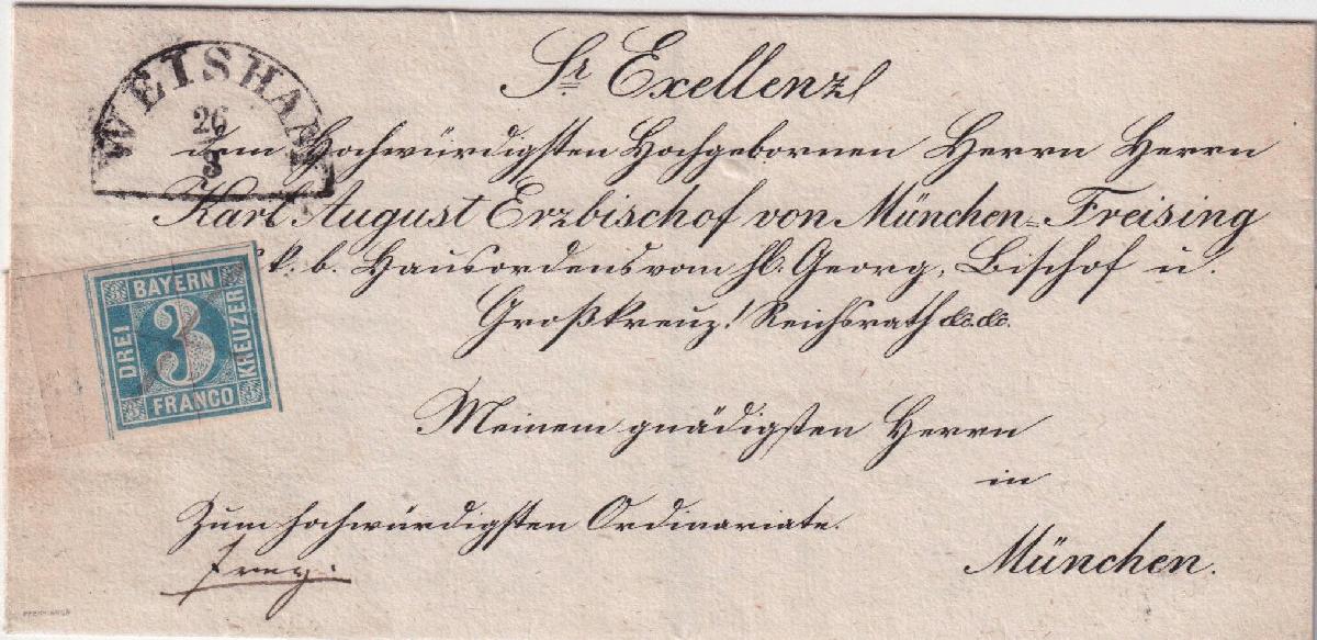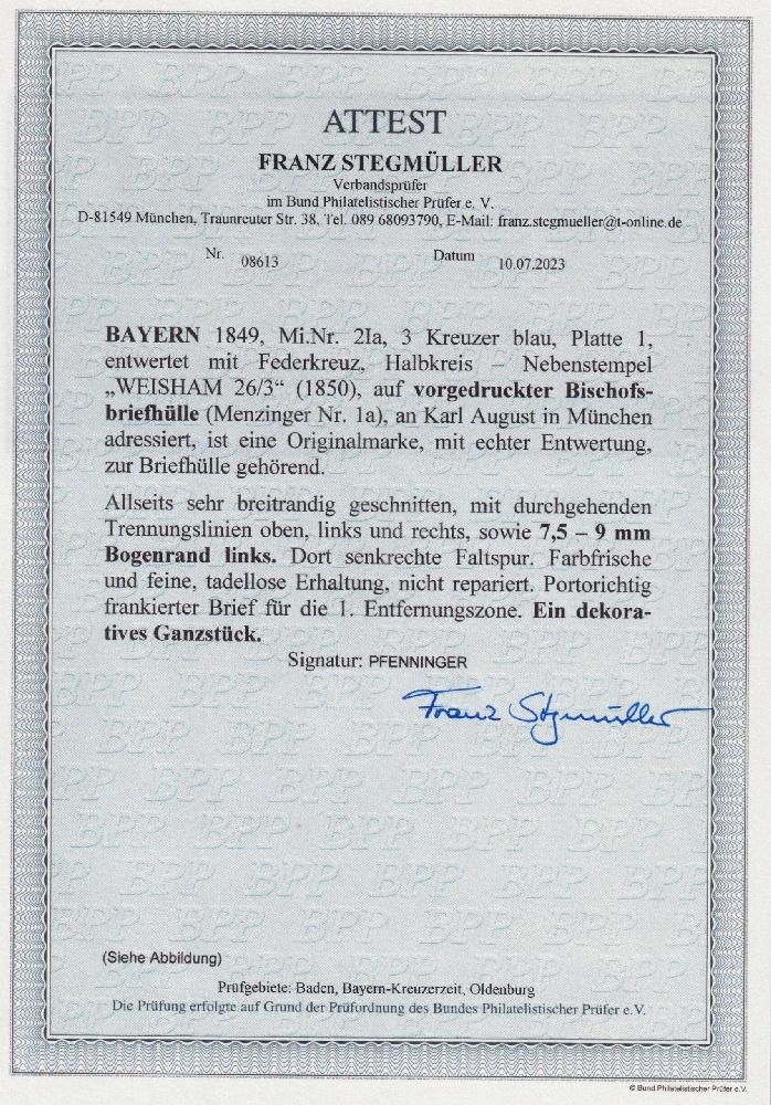 | Zusatzinformationen und Suchstichworte: | Südphila Peter Feuser 100. Jubiläums- & Charity-Auktion 18. November 2023 Los 81 Altdeutschland Bayern 3 Kr. hellblau, sehr breitrandig (mit 9 mm Bogenrand links und sauberem Federkreuz) auf dekorativem lith. Luxus-Bischofsbrief (Menzinger Nr. 1a) mit Segmentstempel WEISHAM an Erzbischof Karl August in München, ein ganz außergewöhnliches Poststück, sign. Pfenninger, Attest Stegmüller Ausruf 1.200,00 EUR |