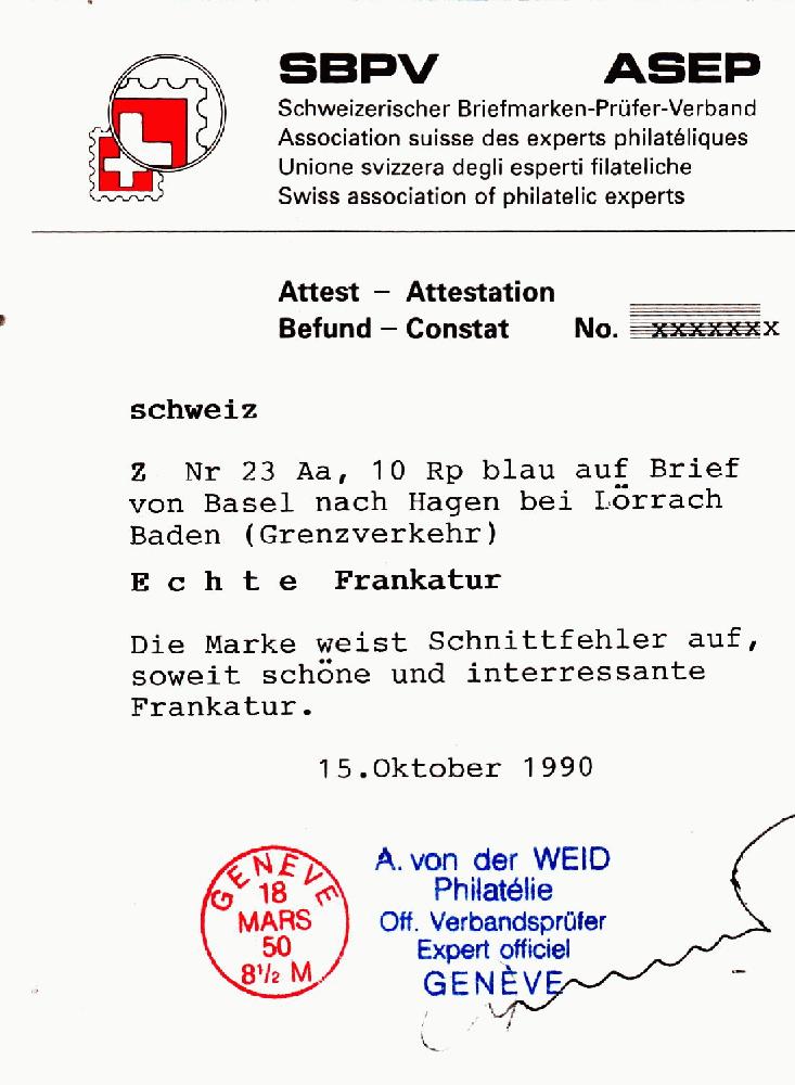 | Prüfer: | von der Weid, Alain (SBPV / ASEP (Schweizerischer Briefmarken-Prüfer-Verband)) |