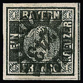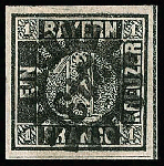 | Zusatzinformationen und Suchstichworte: | Rauhut & Kruschel - 220. Auktion 20. - 21. Oktober 2023 Los 5 Altdeutschland Bayern 1 Kr. schwarz, Platte I, aussergewöhnlich breitrandig und schön zentrisch gestempelt mit gMR "243" (Nürnberg), kleine Schürfstelle oben links, sonst gut. Sign. Rohr und Attest Brettl Zuschlag 850,00 EUR |
