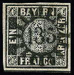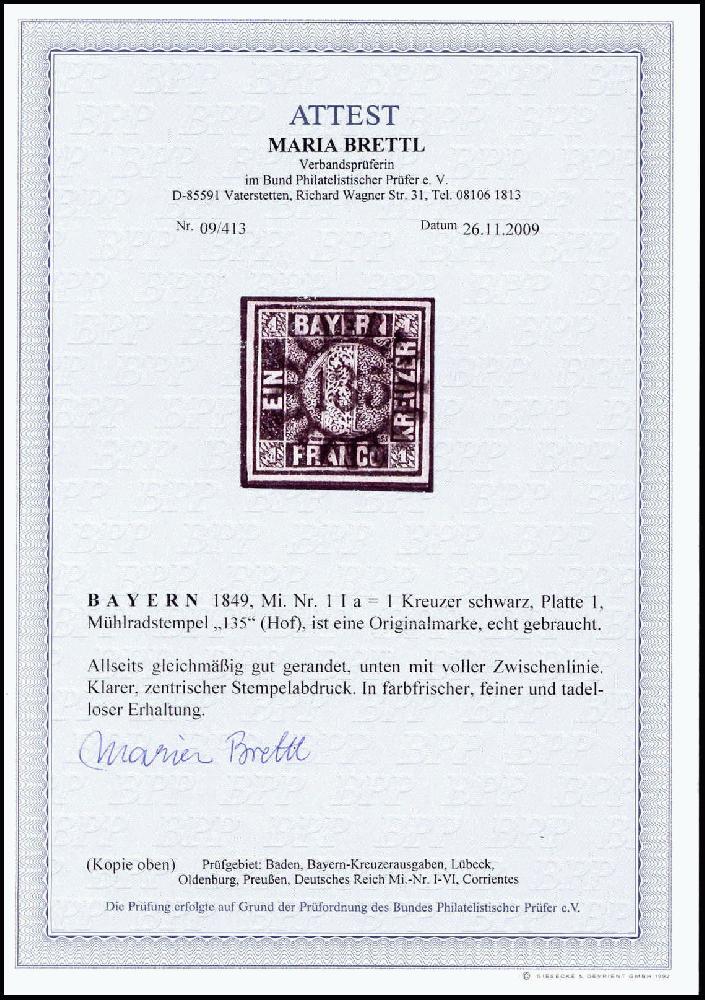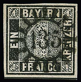 | Zusatzinformationen und Suchstichworte: | Rauhut & Kruschel - 220. Auktion 20. - 21. Oktober 2023 Los 8 Altdeutschland Bayern 1 Kr. schwarz, Platte I, voll-, meist breitrandiges Luxusstück mit ideal zentrischem und gerade aufgesetztem gMR "135" (Hof). Ein Ausnahme-Exemplar, zwei Fotoatteste Brettl Ausruf 2.500,00 EUR |