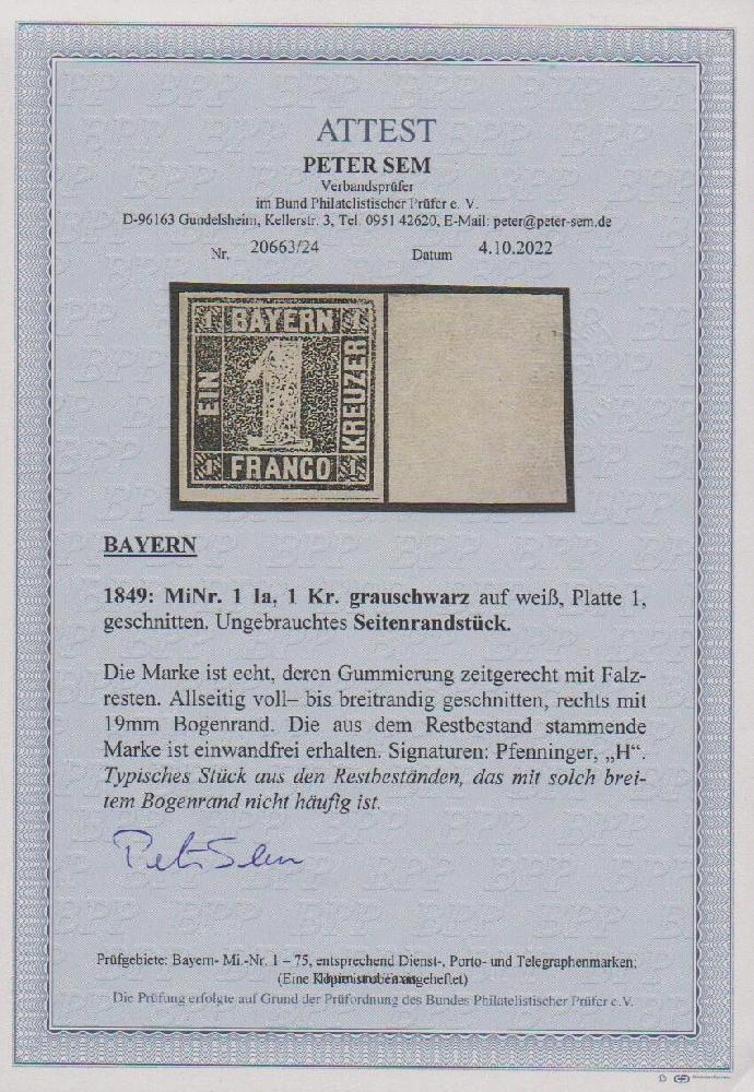 | Zusatzinformationen und Suchstichworte: | Rauhut & Kruschel - 220. Auktion 20. - 21. Oktober 2023 Los 9 Altdeutschland Bayern 1 Kr. grauschwarz, ungebrauchtes Luxusstück mit vollständigem Originalgummi und rechts 19mm breitem Bogenrand, sign. Pfenninger, Hermann sowie Fotoattest Sem ("Typisches Stück aus den Restbeständen, das mit solch breitem Bogenrand nicht häufig ist.") Ausruf 1.200,00 EUR |