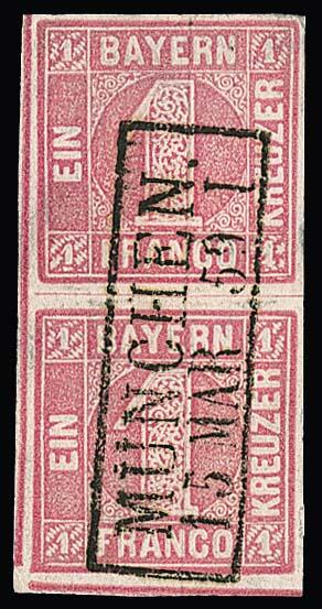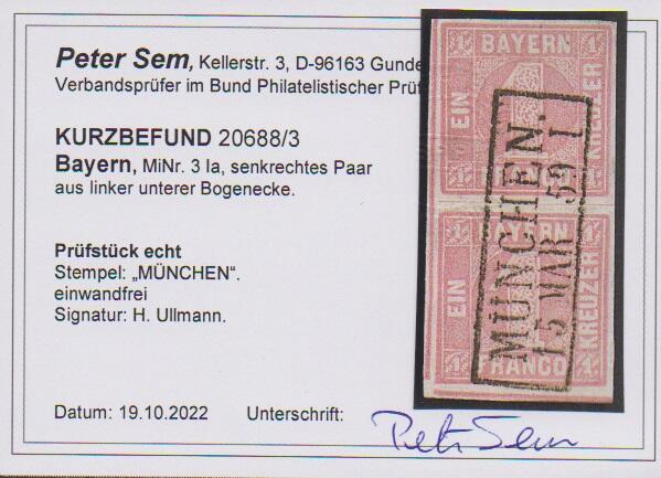 | Zusatzinformationen und Suchstichworte: | Rauhut & Kruschel - 220. Auktion 20. - 21. Oktober 2023 Los 22 Altdeutschland Bayern 1 Kr. rosa, Luxuspaar aus der linken unteren Bogenecke mit vollem Ra2 "München", sign. Ullmann und Fotoexp. Sem Zuschlag 130,00 EUR |