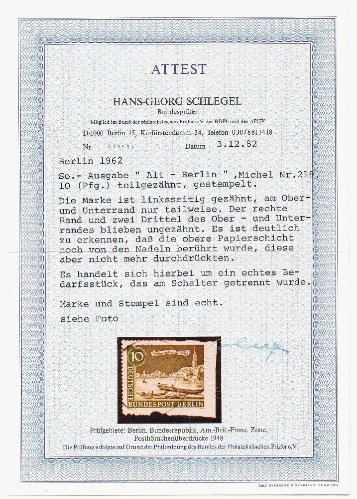 | Zusatzinformationen und Suchstichworte: | Berlin Mi-Nr. 219 mit Teilzähnung (oben, unten, rechts) gestempelt; Entwertung mittels Maschinenstempel BERLIN 11 (Stempeldatum kaum/nicht lesbar). Herkunft: Auktionshaus Friebels (April 1992), Ausruf 500,00 DM, Zuschlag 500,00 DM. |