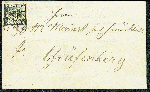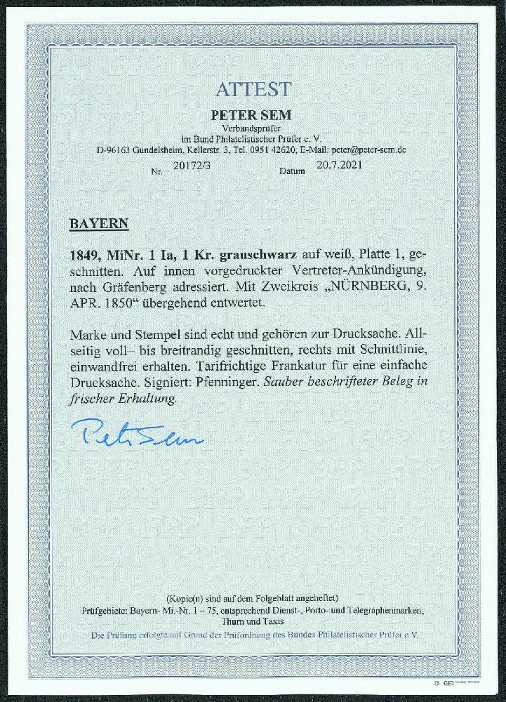 | Zusatzinformationen und Suchstichworte: | Gert Müller 120. Auktion 23. - 25. November 2023 Los 2715 Altdeutschland Bayern 1 Kr. grauschwarz, Platte 1, farbfrisches, allseits perfekt gerandetes Luxusstück, rechts mit vollständiger Schnittlinie auf sehr schöner, portogerecht frankierter vorgedruckter Vertreter-Ankündigung mit K2 "NÜRNBERG 9.APR.1850" nach Gräfenberg. Derart schöne Belege der ersten deutschen Briefmarke, zumal in absolut perfekter Erhaltung, gehören zu den gesuchten Altdeutschland-Raritäten! Fotoattest "EINWANDFREI ERHALTEN" Sem BPP Ausruf 6.000,00 EUR |