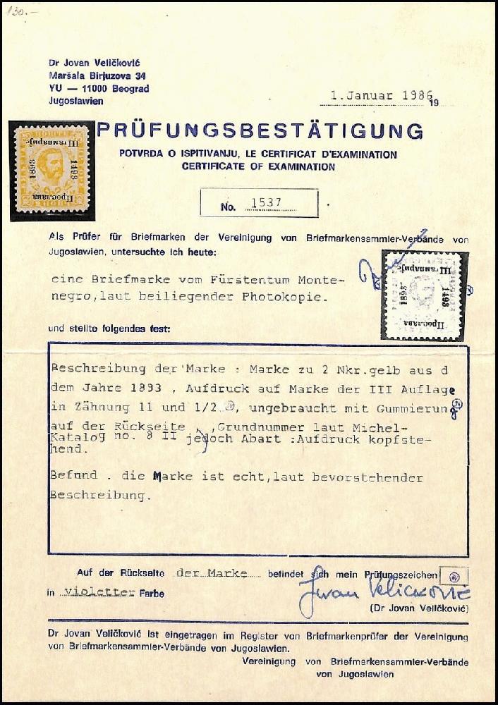 | Zusatzinformationen und Suchstichworte: | Ein ungebrauchtes Exemplar dieses Kopfstehers mit Attest wurde an der 56. SFK Auktion vom 28 Oktober 2023 in Belgrad/Serbien unter Los 694 für 340 € + Aufgeld verkauft. |