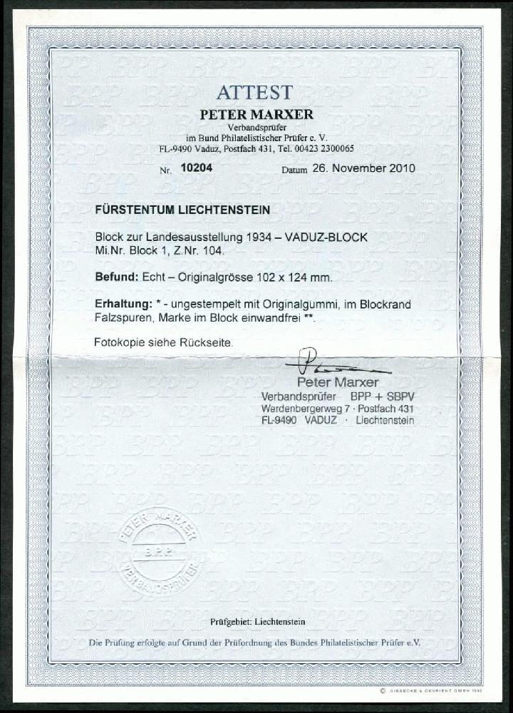 | Zusatzinformationen und Suchstichworte: | 111. Briefmarken Lenz Auktion 6. - 9. November 2023 Los 639 Liechtenstein 1934, Vaduz-Block, im Blockrand Falzspuren, Marke im Block einwandfrei postfrisch - lt. Attest Marxer BPP, Mi.2'800,- Ausruf 400,00 EUR |