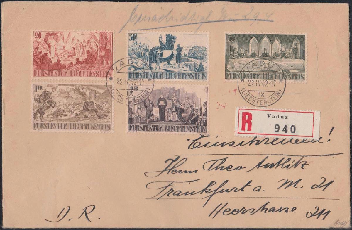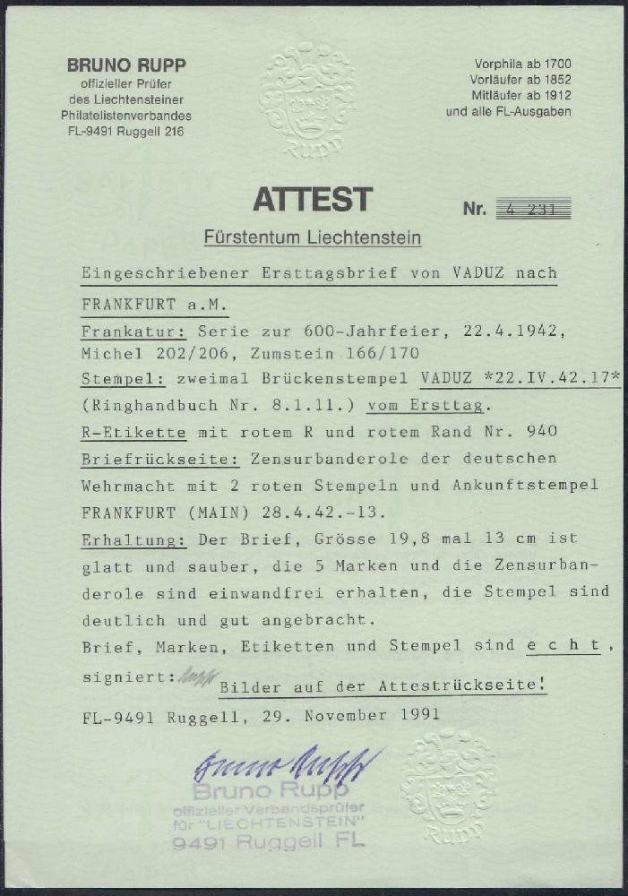 | Zusatzinformationen und Suchstichworte: | 111. Briefmarken Lenz Auktion 6. - 9. November 2023 Los 664 Liechtenstein 1942, FDC Ebf. von Vaduz 22.IV.42 nach Frankfurt a.M. 28.4.42 mit Satz 600. Jahrestag, mit Attest: B. Rupp, Mi.650,- Ausruf 120,00 EUR |