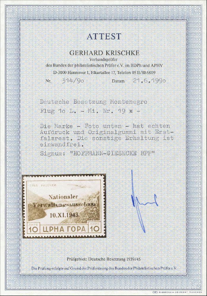 | Zusatzinformationen und Suchstichworte: | 187. Dresdner Briefmarken Auktion 10. - 12. Oktober 2023 Los 2631 Deutsche Besetzung II. WK Montenegro 10 L. farbfrisch, Originalgummi mit Falzrest, Attest vom 21.6.90 Krischke BPP (4.000,-) Zuschlag 1.100,00 EUR |