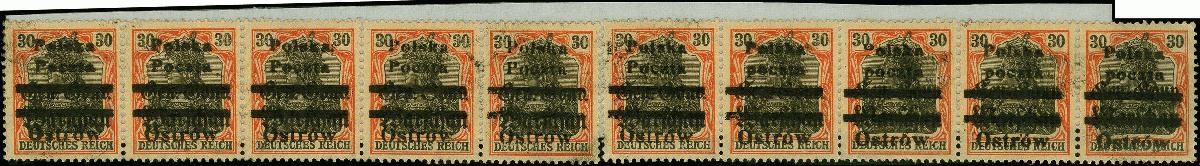 | Zusatzinformationen und Suchstichworte: | Heinrich Köhler 382. Auktion 18. - 23. September 2023 Los 1309 Deutsche Besetzung I. WK Polen Zawierci Germania 30 pfg., former horizontal strip of ten showing the complete setting, seperated between the 5th and 6th stamp, mint never hinged, few light perf seperations, otherwise very fine and rare, signed Mikulksi with certificate (2009) and certificate Petriuk (2023) Ausruf 1.200,00 EUR |