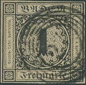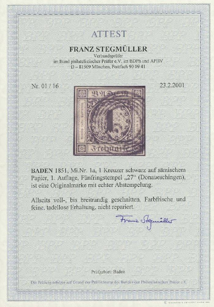 | Zusatzinformationen und Suchstichworte: | Ulrich Felzmann 179. Auktion 16. November 2023 Los 2001 Altdeutschland Baden 1 Kreuzer auf sämisch, allseits voll- bis breitrandiges Kabinettstück in farbfrischer Gesamterhaltung, mit Fünfringstempel "27" - DONAUESCHINGEN, ein sehr frisches Exemplar der in diesem Schnitt seltenen Marke, Fotoattest Stegmüller BPP "Farbfrische und feine, tadellose Erhaltung.", € 2.000,- Ausruf 500,00 EUR |