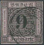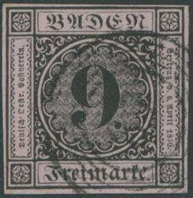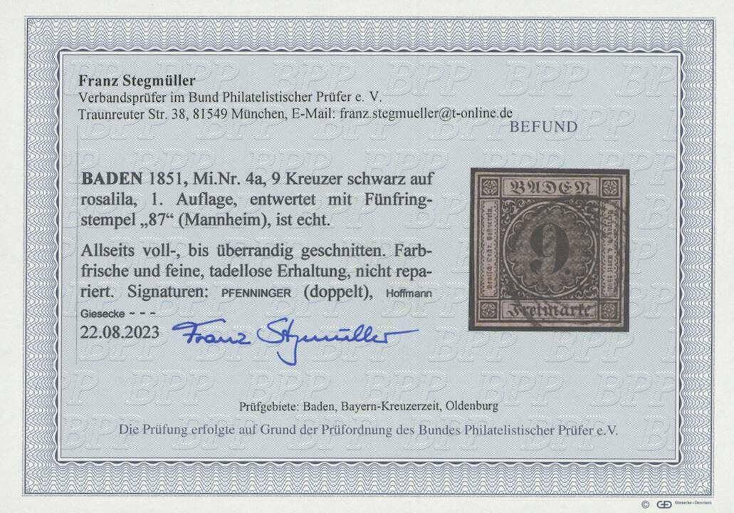 | Zusatzinformationen und Suchstichworte: | Ulrich Felzmann 179. Auktion 16. November 2023 Los 2003 Altdeutschland Baden 9 Kreuzer auf rosalila, 1. Auflage, voll- bis überrandiges und farbfrisches Kabinettstück, entwertet mit Fünfringstempel "87" - MANNHEIM, sign. Pfenninger und Hoffmann-Giesecke sowie Fotobefund Stegmüller BPP "Farbfrische und feine, tadellose Erhaltung." Ausruf 100,00 EUR |