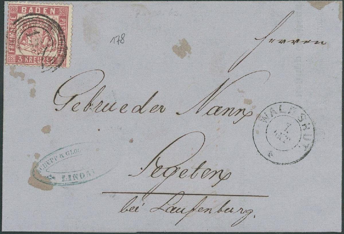 | Zusatzinformationen und Suchstichworte: | Ulrich Felzmann 179. Auktion 16. November 2023 Los 2030 Altdeutschland Baden 3 Kreuzer rosakarmin, vollzähniges und farbfrisches Kabinettstück, Einzelfrankatur von "153" WALDSHUT mit nebengesetztem Zweikreisstempel vom 7 OKT (1862) nach Segeten, tadellos, Fotoattest Brettl BPP "Alle Zähne vorhanden und in farbfrischer, feiner Erhaltung. Völlig tadellos, nicht repariert.", € 500,- Ausruf 200,00 EUR |