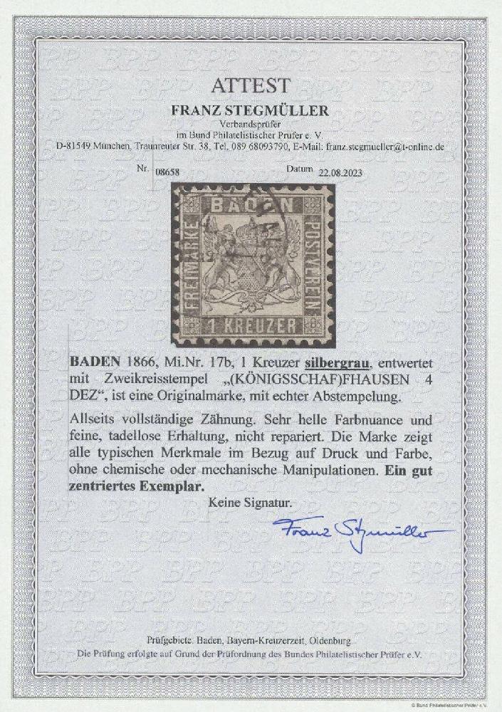 | Zusatzinformationen und Suchstichworte: | Ulrich Felzmann 179. Auktion 16. November 2023 Los 2036 Altdeutschland Baden 1 Kreuzer silbergrau, farbfrisches und vollzähniges Kabinettstück, entwertet mit Zweikreisstempel (KÖNIGSSCHAF)FHAUSEN 4 DEZ., unsigniert, Fotoattest Stegmüller BPP: "Sehr helle Farbnuance und feine, tadellose Erhaltung. Ein gut zentriertes Exemplar.", € 3.000,- Ausruf 1.000,00 EUR |
