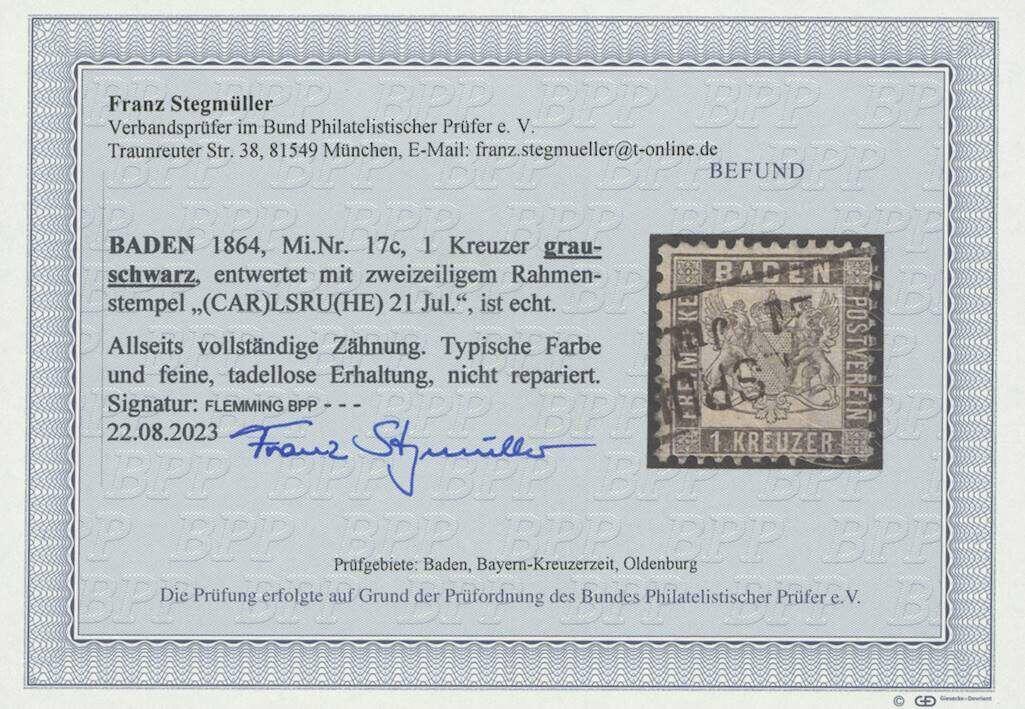 | Zusatzinformationen und Suchstichworte: | Ulrich Felzmann 179. Auktion 16. November 2023 Los 2037 Altdeutschland Baden 1 Kreuzer grauschwarz, farbfrisches und vollzähniges Kabinettstück, entwertet mit Ra2 (CAR)LSRU(HE) 21 Jul., sign. Flemming und Fotobefund Stegmüller BPP "Typische Farbe und feine, tadellose Erhaltung.", € 350,- Ausruf 100,00 EUR |