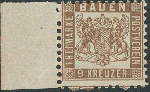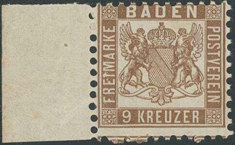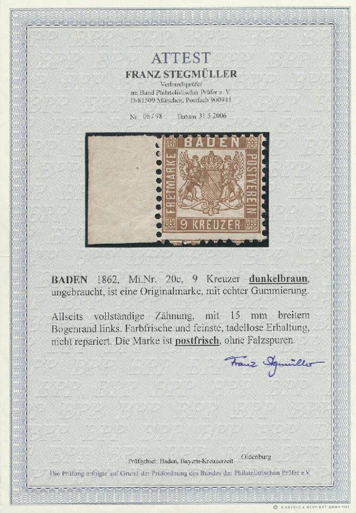 | Zusatzinformationen und Suchstichworte: | Ulrich Felzmann 179. Auktion 16. November 2023 Los 2038 Altdeutschland Baden 9 Kreuzer dunkelbraun, farbfrisches und vollzähniges Kabinettstück mit links 15 mm breitem Bogenrand in postfrischer Ausnahmeerhaltung ohne jegliche Signatur, in dieser Qualität eine große Rarität, Fotoattest Stegmüller BPP "Farbfrische und feinste, tadellose Erhaltung. Die Marke ist postfrisch, ohne Falzspuren.", € 1.500,- Ausruf 1.000,00 EUR |