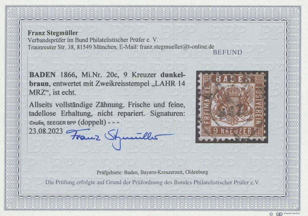 | Zusatzinformationen und Suchstichworte: | Ulrich Felzmann 179. Auktion 16. November 2023 Los 2039 Altdeutschland Baden 9 Kreuzer dunkelbraun, farbfrisches und vollzähniges Kabinettstück, entwertet mit Zweikreisstempel LAHR 14 MRZ, sign. Seeger BPP (doppelt) und Fotobefund Stegmüller BP: "Frische und feine, tadellose Erhaltung.", € 600,- Ausruf 180,00 EUR |