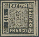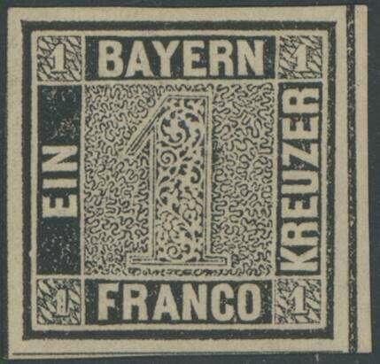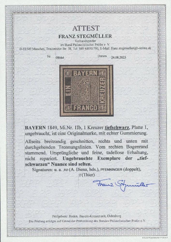 | Zusatzinformationen und Suchstichworte: | Ulrich Felzmann 179. Auktion 16. November 2023 Los 2050 Altdeutschland Bayern 1 Kreuzer tiefschwarz, Platte 1, allseits breitrandiges und farbfrisches Kabinettstück vom rechten Bogenrand, unten volle Trennungslinie, ungebraucht mit Originalgummierung, sign. Diena, Pfenninger und Thier sowie Fotoattest Stegmüller BPP "Ursprüngliche und feine, tadellose Erhaltung ... Ungebrauchte Exemplare der tiefschwarzen Nuance sind selten.", € 3.500,- Ausruf 1.500,00 EUR |